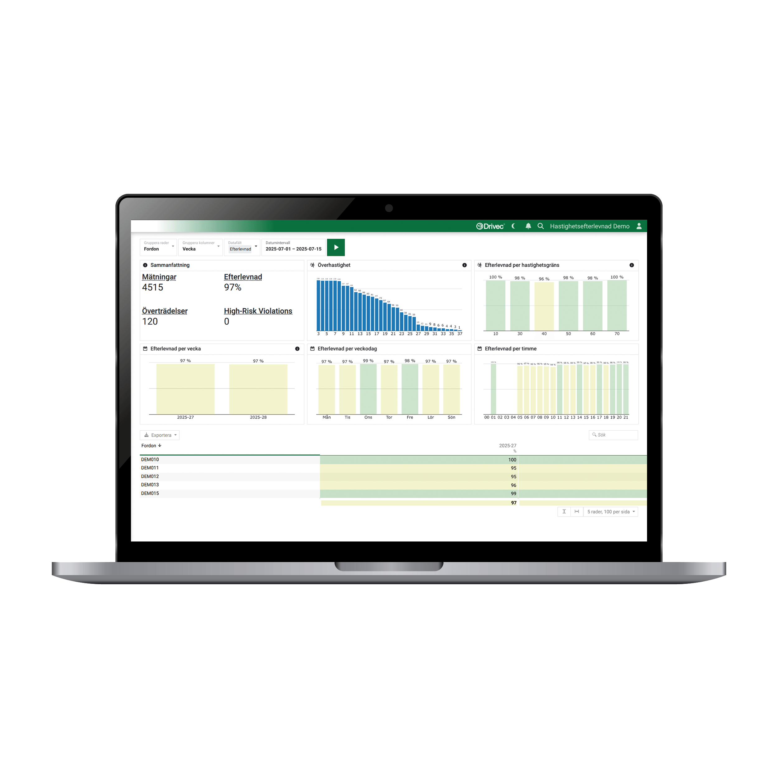 Drivec Safety baseras på Trafikverkets databas över det svenska vägnätet (NVDB) och kan kontrollera hastigheter i hela Sverige. Fordonets position och hastighet rapporteras till Drivec Cloud och jämförs dagligen mot hastighetsgränserna. Detaljerad filtrering gör det möjligt att analysera överträdelser på förar-, trafikområde- och fordonsnivå.